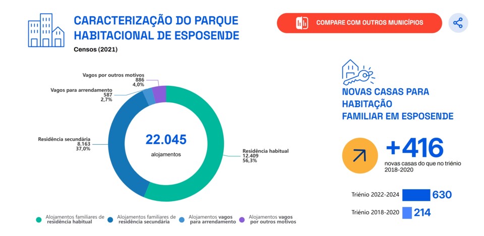No triénio de 2022 a 2024, foram construídas 630 novas casas para habitação, o que corresponde a um aumento de 416 casas, comparando com o triénio de 2018 a 2020, onde foram construídas 214 novas casas para habitação.